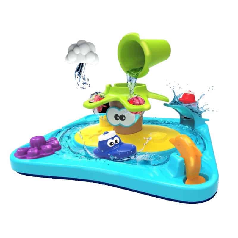 Zabawa na Wyspie: Ta kolorowa wyspa pełna jest ruchomych elementów, takich jak ośmiorniczka, delfinek, łódeczki, zjeżdżalnia i miękka chmurka z dziurkami, która wypełni wyspę deszczem, kiedy ją napełnisz wodą.