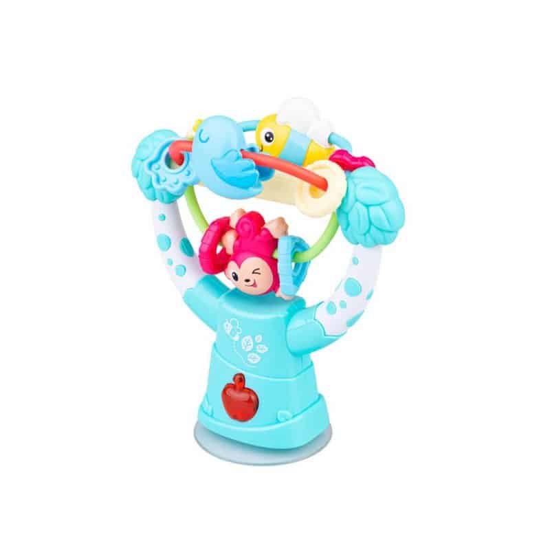 Ta zwierzakowa karuzelka to pomysł na zabawę pełną dźwięków. Obrotowy kołowrotek zawiera ruchomą małpkę, ptaszka i kolorowe koraliki. Po naciśnięciu czerwonego jabłuszka w dolnej części zabawki, usłyszysz melodie i wesołe odgłosy.