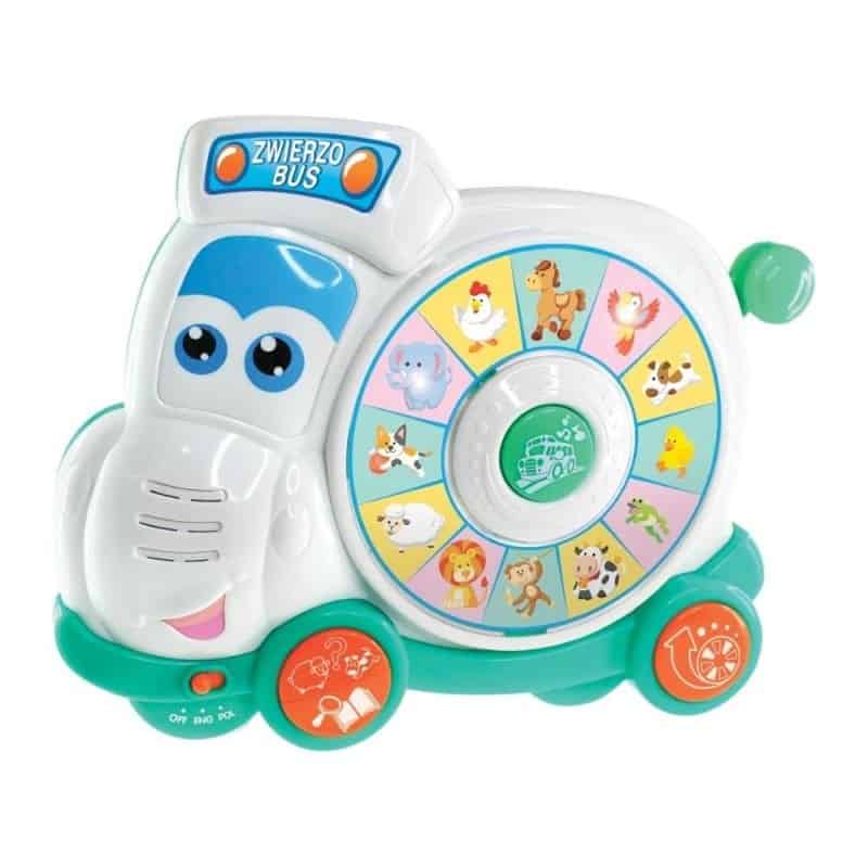 Z drogi śledzie, bo ZwierzoBus jedzie! Ten wesoły, dwujęzyczny autobus posiada wielu pasażerów, a są nimi kolorowe zwierzątka. Naciskaj poszczególne przyciski i przesuwaj dźwignię, aby dowiedzieć się więcej na ich temat oraz posłuchać słodkich melodii. ZwierzoBus kryje w sobie też quiz, w którym maluch musi wskazać konkretne zwierzątko, poprzez przyciskanie tylnego koła pojazdu do momentu, aż podświetli się właściwy obrazek. Jeśli znudzi nam się zabawa w języku polskim, wystarczy przełączyć język na angielski i razem z autobusem wyruszyć w zupełnie nową podróż!